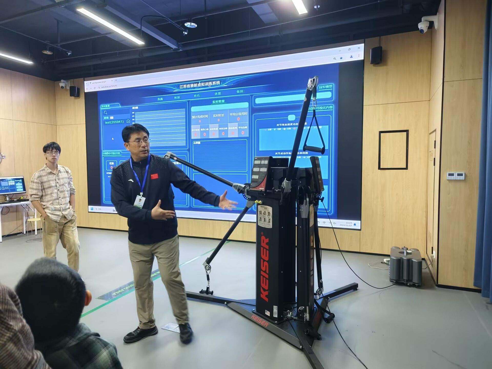 吴畏、陈丽、窦如林、杜岚、陈龙等从数字体育微专业课程实践教学要求出发,带领学生深度体验和操作“研究中心”的各类数字化运动训练设备和研发仪器。黄承斌为师生介绍了南通铁人运动用品有限公司的数字化运动装备制作工艺、特征、技术优势、市场前景与人才需求。