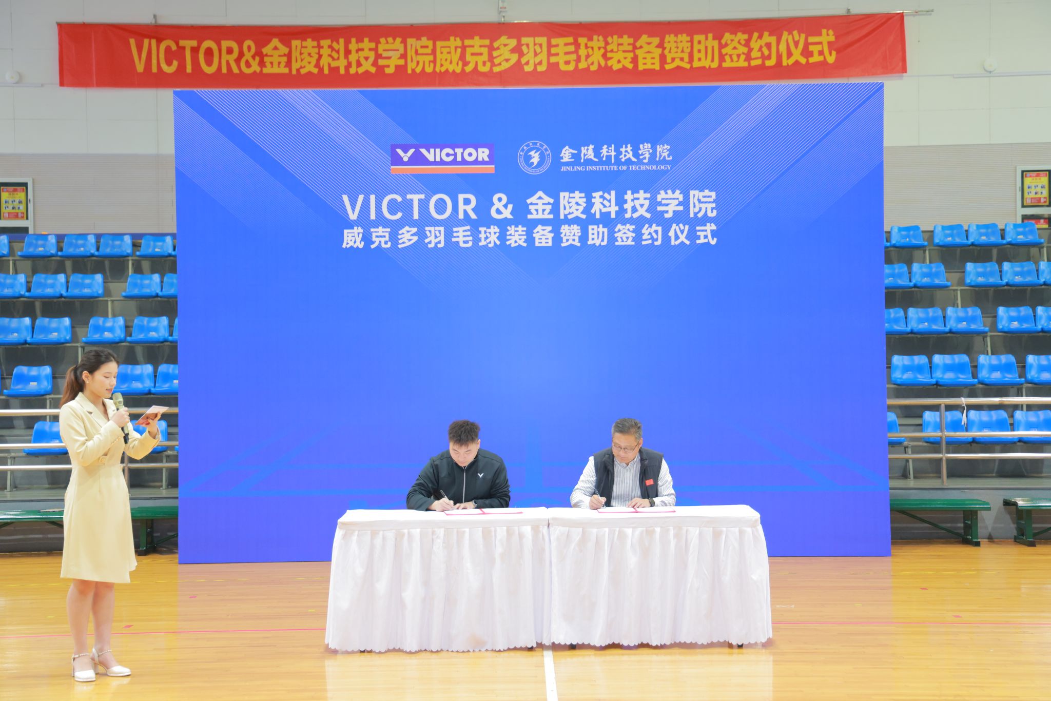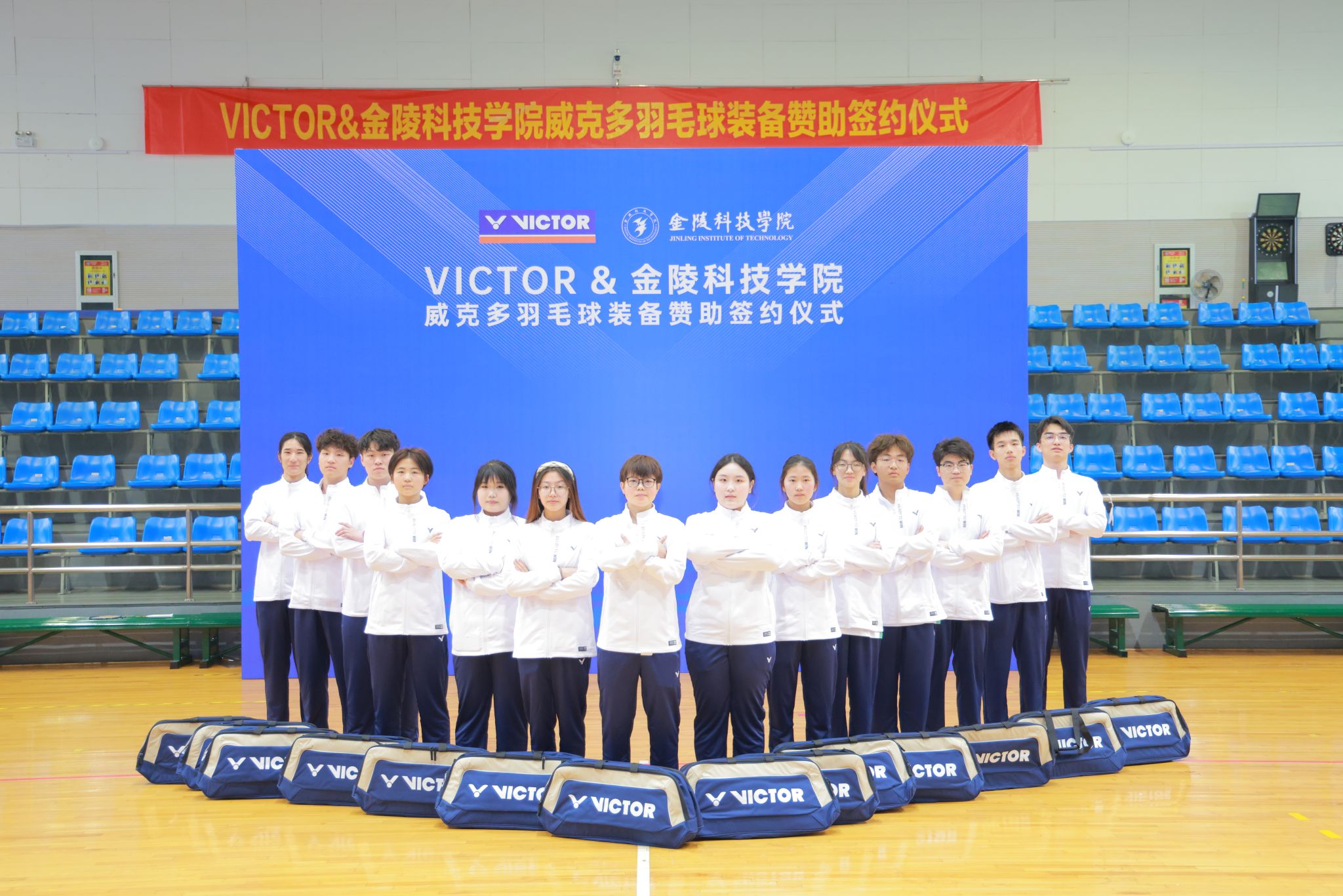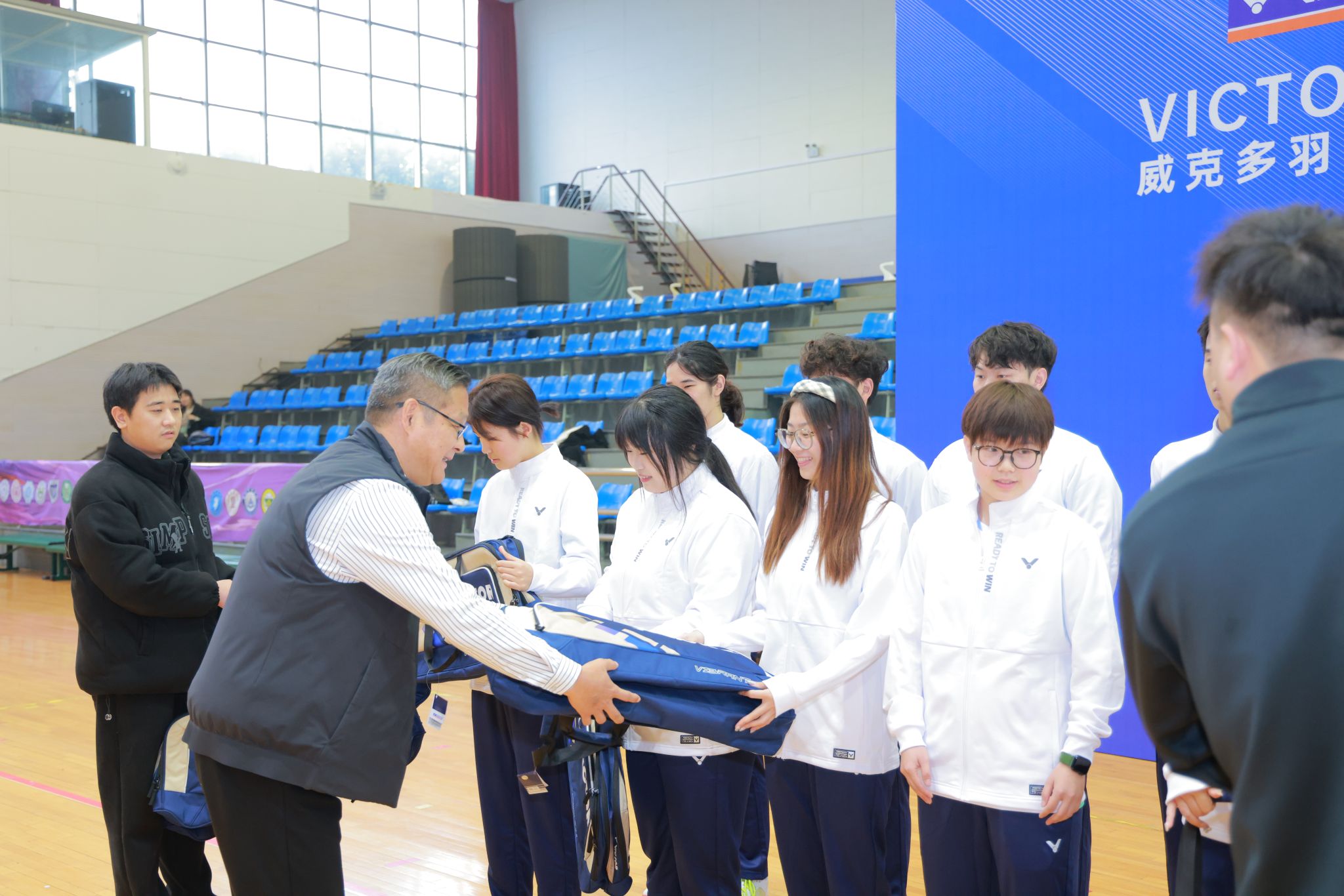 在双方代表的见证下,沈辉主任与赵洪亮经理郑重签署了合作协议。这一协议的签署,标志着我校羽毛球队与江苏威克多体育用品有限公司的合作正式拉开序幕,双方将在资源共享、优势互补的基础上,共同推动羽毛球运动的普及与提高,为培养更多优秀的羽毛球人才贡献力量。仪式结束后,沈辉主任与赵洪亮经理为校羽毛球队队员分发了崭新的羽毛球装备。